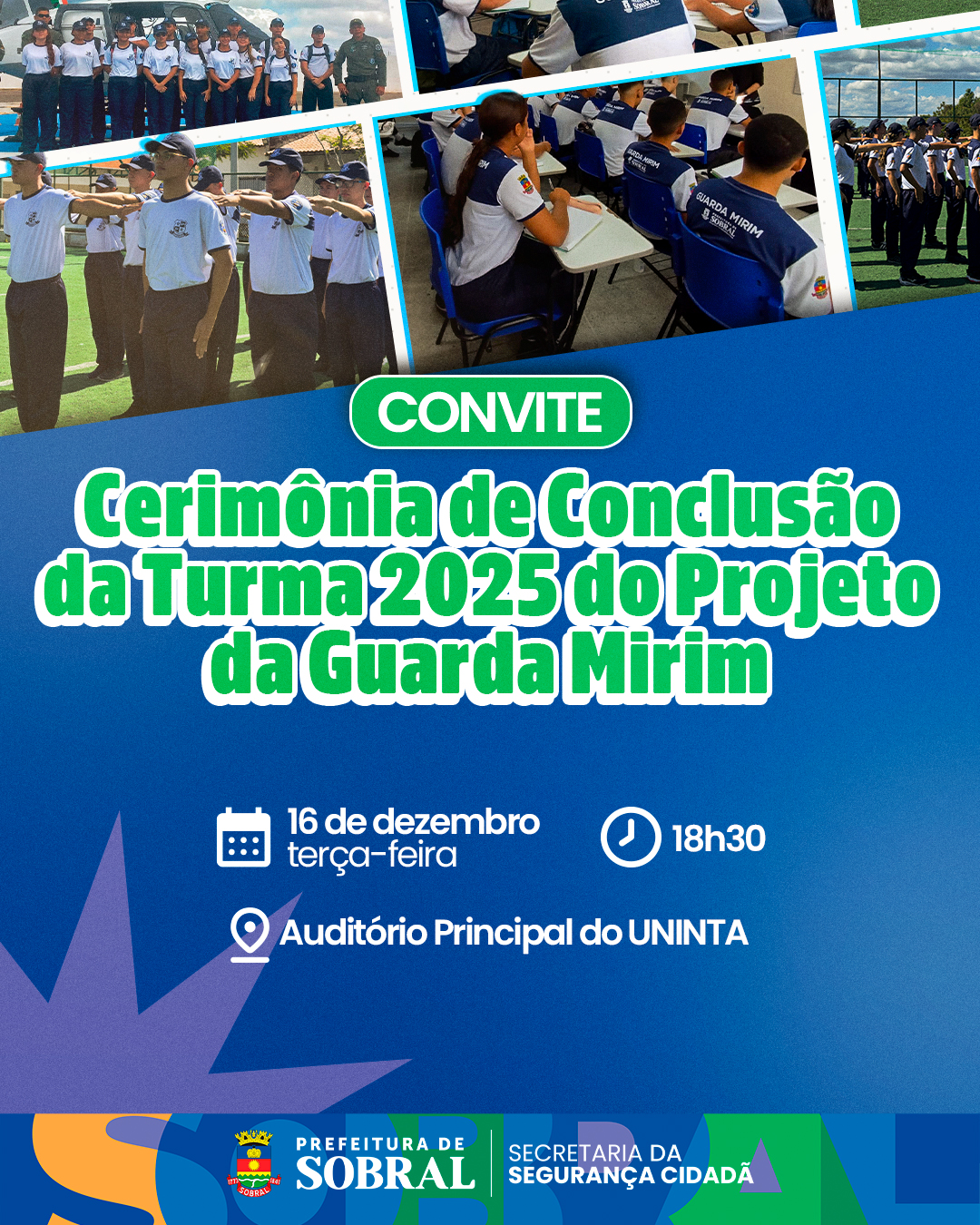 A Prefeitura de Sobral, por meio da Secretaria da Segurança Cidadã (SESEC) e da Coordenadoria da Cidadania, realiza na próxima terça-feira (16/12), às 18h30, no Auditório do UNINTA, a Cerimônia de Conclusão da Turma 2025 do Projeto Guarda Mirim.